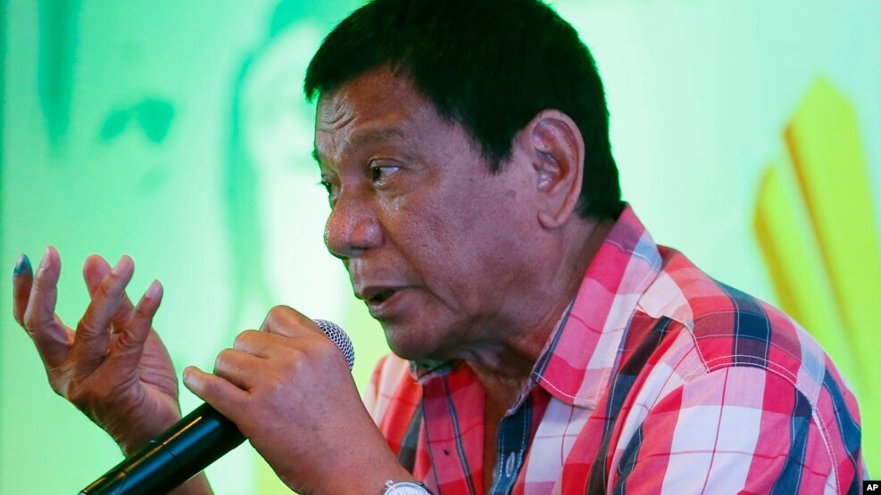 លោក Duterte ដែលមានអាយុ៧១ឆ្នាំបានទទួលការគាំទ្រដោយសារការនិយាយបែបប្រមាថមើលងាយរបស់លោកដោយលោកបានសន្យាថា នឹងប្រយុទ្ធប្រឆាំងនឹងឧក្រិដ្ឋកម្មនិងអំពើពុករលួយ ដែលមានរួមបញ្ចូលការសន្យាថានឹងប្រហារជីវិតពួកឧក្រិដ្ឋជន។ ការនិយាយដូច្នេះ ធ្វើឱ្យមានការប្រៀបធៀបលោកទៅនឹងលោក Donald Trump បេក្ខជនប្រធានាធិបតីស.រ.អា.ខាងគណបក្សសាធារណរដ្ឋ។